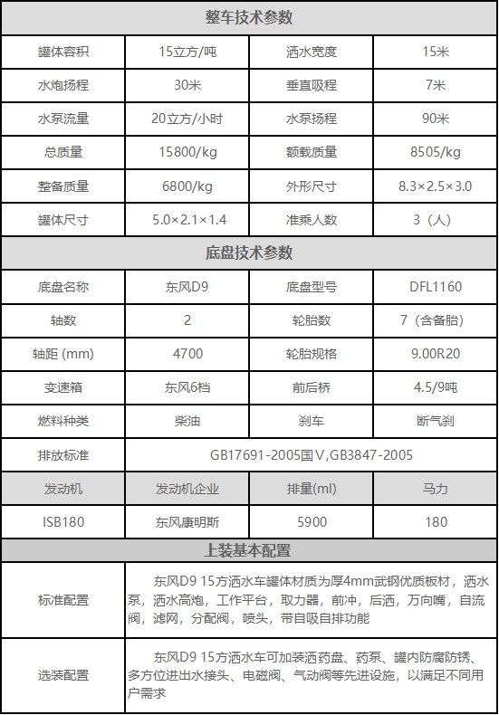 3950軸距 玉柴200馬力/康機(jī)210馬力, 2315/排半,法士特6檔變速箱,295/80R22.5,前后橋3.9/8德納,250雙層車架,動(dòng)轉(zhuǎn),離合助力,電動(dòng)門窗中空鎖,空調(diào),斷氣剎,排氣制動(dòng),ABS ,采用大流量水泵,大通徑球閥、基本灑水功能前沖、后灑、側(cè)噴、工作平臺(tái)帶軸承高炮(可調(diào)節(jié)成霧狀、直柱狀)、可泵進(jìn)泵出、罐體兩側(cè)圓形炮筒、帶兩根抽水軟管,(尾部可加裝30米霧炮機(jī)組)